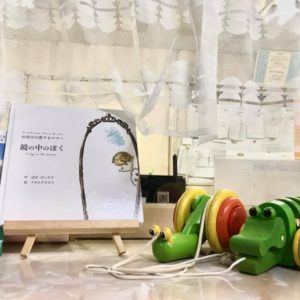 園さんに到着して玄関を開けると、とても嬉しいことに、保護者様へのオススメの絵本として園の入り口に「鏡の中のぼく」を可愛らしいおもちゃと並べて置いて下さってました❤︎